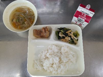 今日の献立は、鶏肉のなにわ甘辛ソースかけ・船場汁・こまつなの炊いたん・ごはん・牛乳です。鶏肉には、刺激的なソースが使われ(しょうが、にんにく、砂糖、米酢、うすくちじょうゆ、ウスターソース)、おいしかったです。船場汁は、すまし汁にしゃけのかたまりが入り、おいしかったです。たいたんは、間違いなく、大阪の味でした。