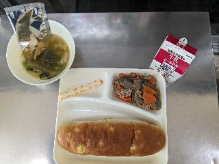 今日の献立は、豚肉とごぼうの煮もの・なにわうどん・棒チーズ・ごはん・牛乳です。