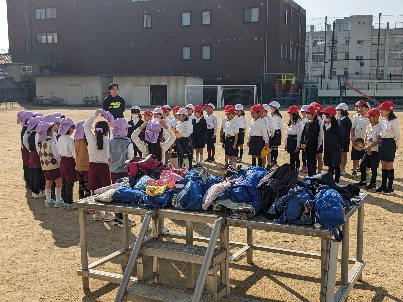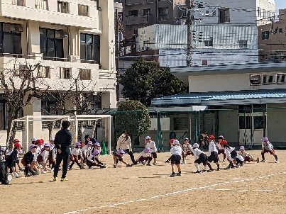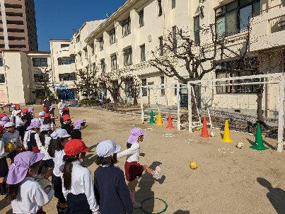 東小橋幼稚園の園児たちが来校し、1年生と体育の授業で交流しました。一緒に準備体操をして、ボール遊びをしました。みんな元気に、ゴールめがけてボールをけっていました。楽しく交流することができました。