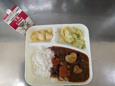 今日の献立は、ハヤシライス・キャベツのバジル風味サラダ・洋なし(カット缶)・牛乳です。