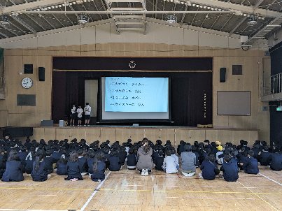 講堂で児童集会を行いました今日の集会は、環境委員会の発表でした。日ごろの活動の様子を、クイズ形式で発表していました。学級菜園に植えられている野菜の問題が難しく、間違いのねぎを選んだ子が多くいました。今もねぎは植えられているので見てみましょう。