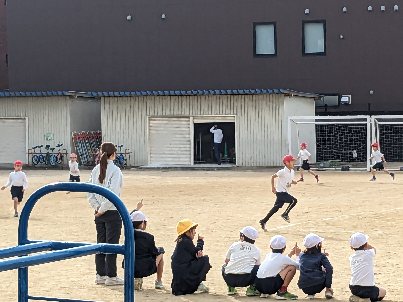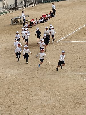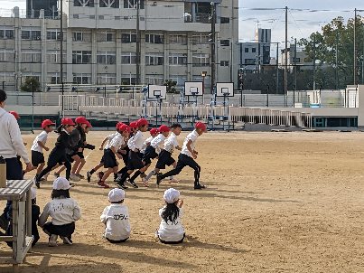 体育の授業の様子です。運動場で持久走の記録をとっていました。音楽に合わせてリズミカルに走っていました。みんな自分の目標を目指してがんばっていました。