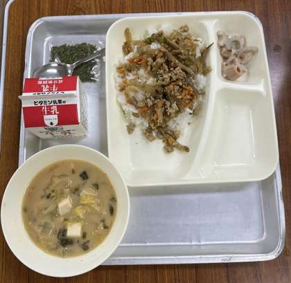 今日の献立は、鶏ごぼうご飯、みそ汁、焼きれんこん、牛乳です。