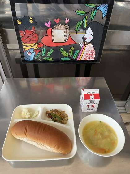 今日の献立は、豚肉のカレー風味焼き、コーンとはくさいのスープ、カリフラワーのレモンドレッシング、黒糖パン、牛乳です。