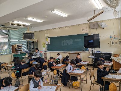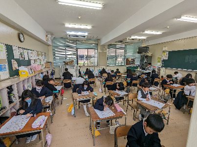 算数の授業の様子です。テストをしていました。1年生のまとめのテストです。今まで習ってきた内容を全部覚えているかな。しっかりがんばりましょう。