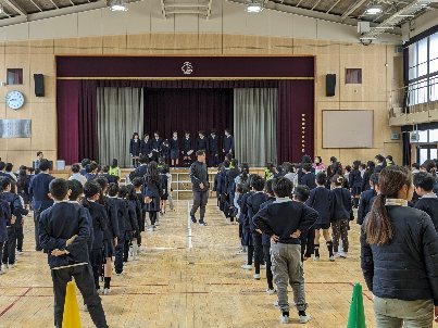 今年度最後の児童集会を講堂で行いました。今日は豪華2本立てでした。何人通ったでしょうと、タッチリレーをしました。