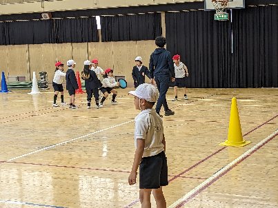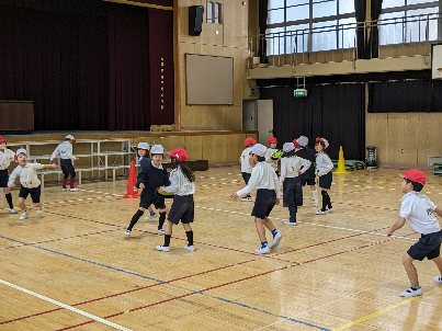体育の授業の様子です。講堂での最後の授業です。フライングディスクを使ってゲームをしていました。みんな楽しくゲームをしていました。みんな上手に投げたり、受けたりしていました。