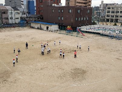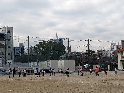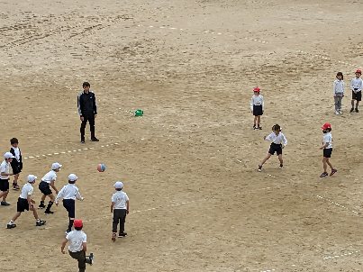 体育の授業の様子です。短縄跳びをして、その後にドッジボールをしていました。少し冷たい風の中、楽しそうに体を動かしていました。