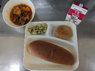 今日のメニューは、チキンレバーカツ・ケチャップ煮・ツナとキャベツのバジルソテー・黒糖パン・牛乳です。