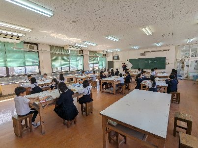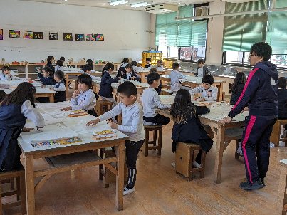 図画工作科の授業の様子です。図工室で、作品袋にイラストを描いていました。このイラストも立派な作品ですよね。できあがりが楽しみです。