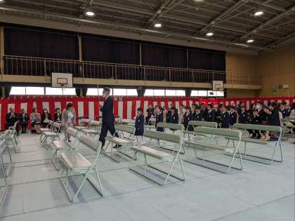 満開の桜のもと、38人の新入生を迎えて、入学式を行いました。1組・2組の入場の様子です。1年生の入場を拍手で迎えました。