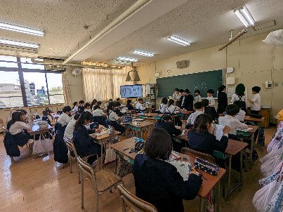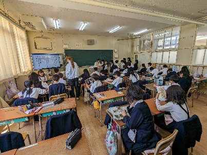 学級活動の授業の様子です。自己紹介カードを書いていました。似顔絵も描き、できたものを先生に見せていました。見ながら笑顔になっていたのが印象的でした。自分のことを早く先生に知ってもらいたいですよね。