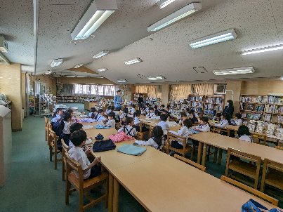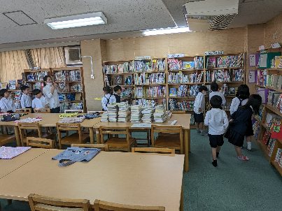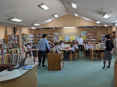 図書館での活動の様子です。初めて学校図書館にきたので、先生から、図書館の使い方や本の借り方などを教えてもらいました。説明を聞いてから、今日借りて帰る本を2冊選んでいました。