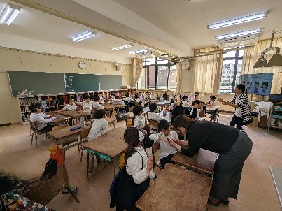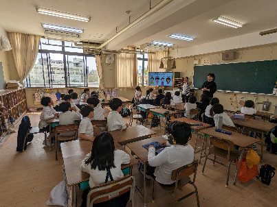 外国語活動の授業の様子です。C−NETの英語で出すクイズに答えていました。ミシェルC−NETの呼び名は何というか等の、4択クイズをしっかり耳で聴き、回答していました。正解するととても喜んでいました。