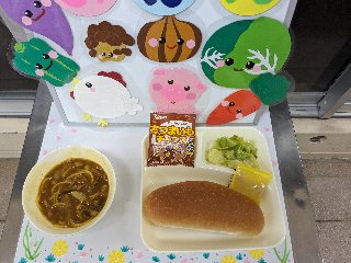 今日のメニューは、カレースープスパゲッティ・キャベツのピクルス・おさつチップス・コッペパン・アプリコットジャムジャム・牛乳です。