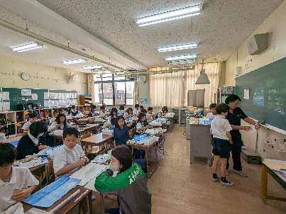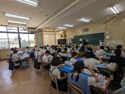 図画工作科の授業の様子です。絵の具で空と海の風景を描いていました。どちらも青色系の絵の具を使い使いますが、塗り方を工夫して区別して描いていました。みんな上手に書いていたので教室に掲示すると大海原が完成するのではないでしょうか。