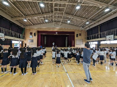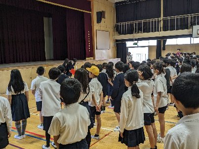 雨上がりで運動場のコンディションがよくなく、講堂で全校朝会を行いました。今週から運動委員会による姿勢ストレッチが始まりました。よい姿勢で過ごせるようにがんばりましょう。