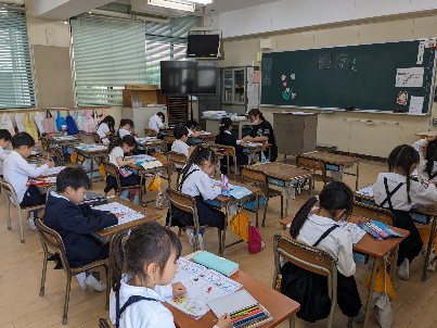国語の授業の様子です。ひらがなの学習をしていました。「え」をノートに書いていました。ていねいに1字ずつ書いていました。
