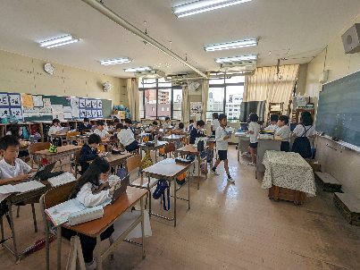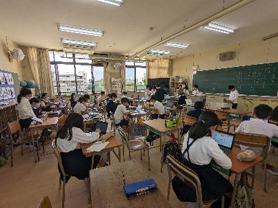 社会科の授業の様子です。パソコンを使って、世界の国についてのクイズを作っていました。社会の学習にもなるし、文章を組み立てるので国語の学習にもなりますね。情報機器の活用スキルも上がりますね。それにクイズですから楽しさが加わります。1石何鳥やろ?