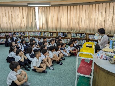 読書活動の授業の様子です。絵本の読み聞かせをしてもらっていました。静かに集中して聴いていました。ゴールデンウイークがはじまるので、本をたくさん借りて読みましょう。