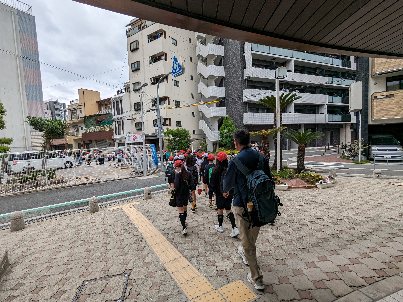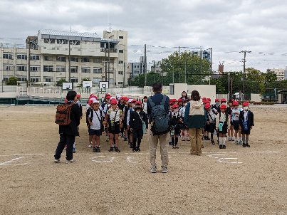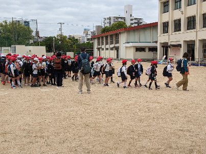 3・4年生の遠足の様子です。運動場に集合して海遊館に行きます。曇り空で少し肌寒いですが、元気に出発しました。この後は、晴れてくるようなので、楽しんできてください。