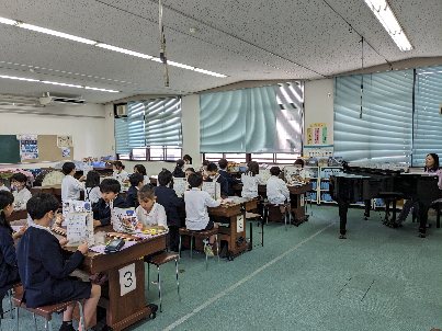 音楽の授業の様子です。こいのぼりの合唱をしていました。明るく元気で素敵な歌声が、運動場からも聞こえていました。とっても素晴らしかったです。