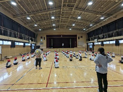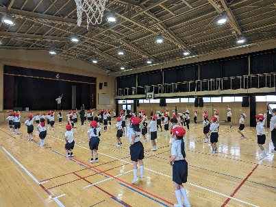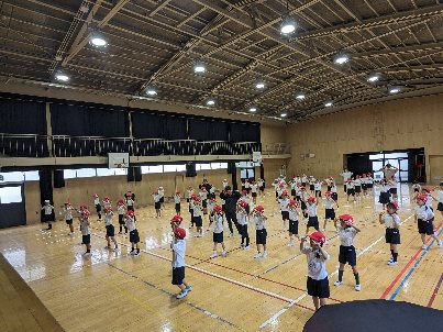 運動会練習の様子です。今日から運動会の練習が始まりました。講堂で、団体演技の練習をしていました。先生の動きを見て、動作を覚えていました。本番に向けてがんばりましょう。