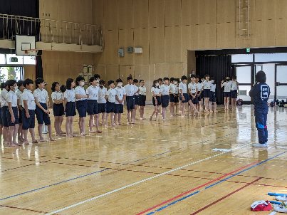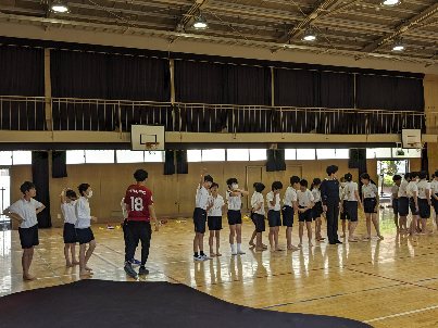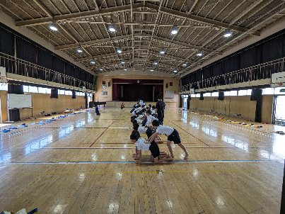 体育の授業の様子です。講堂で、団体演技の練習をしていました。組体操の練習です。素早い動きでしたが、遅れないようにがんばっていました。呼吸を合わせてがんばりましょう。