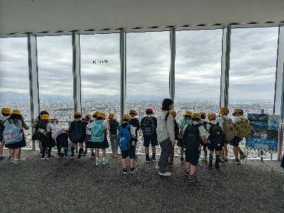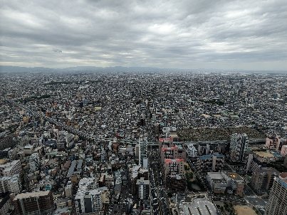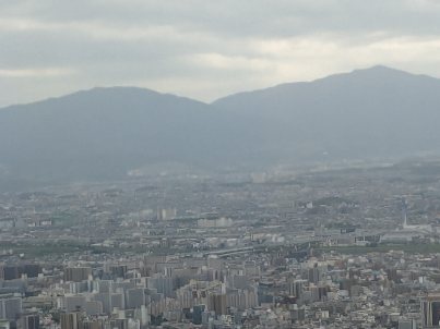 南側の様子です。ヤンマースタジアム長居が写っています。右の山が大阪の最高峰、金剛山で左の山が葛城山です。