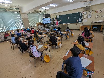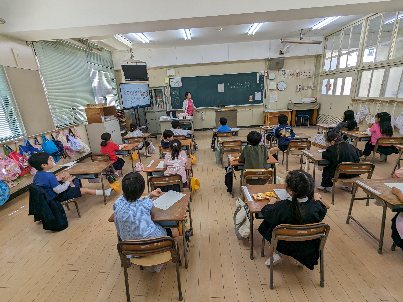 図画工作科の授業の様子です。運動会の旗を描いていました。運動会当日まで、玄関に飾る旗です。先生のお話の通りに、画面いっぱいに大きく描きましょうね。