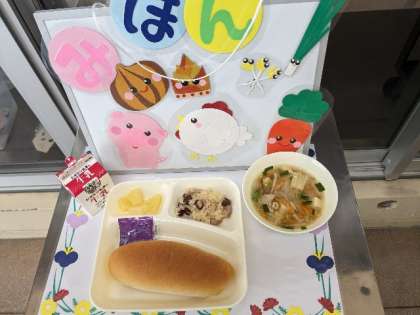 今日のメニューは、金時豆の中華おこわ・中華スープ・パインアップル(カット缶)・コッペパン・ブルーベリージャム・牛乳です。