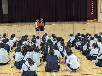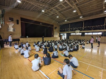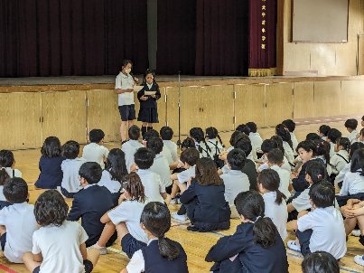看護当番から今週の目標についてのお話がありました。それに続いて、代表委員会から運動会の目標について、給食委員会から残食0週間についてのお知らせがありました。