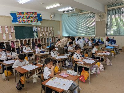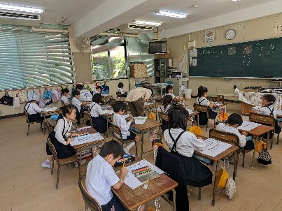 算数の授業の様子です。すうじのおけいこのプリントをしていました。早く書けた子は、色塗りをしていました。ていねいに塗ることも1年生にとっては、大切な学習ですね。