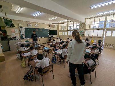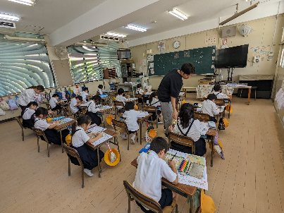 算数の授業の様子です。プリントで線をなぞる練習をしてい早くできた子できた子は、イラストに色を付けていました。ていねいに色を塗るのも、1年生にとって大切な学習です。