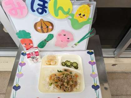 今日の献立は、豚丼・きゅうりの梅風味・白玉だんご(きな粉)・ごはん・牛乳です。