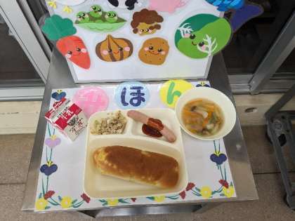 今日のメニューは、ウインナーのケチャップソース・スープ・焼きキャベツ・おさつパン・牛乳です。