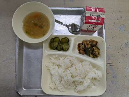 今日の献立は、ホイコウロー・中華スープ・きゅうりのピリ辛あえ・ごはん・牛乳です。