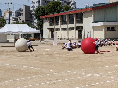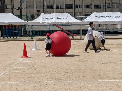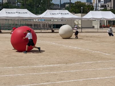 運動会の団体競技の練習をしていました。今年は大玉転がしをします。身長より大きな玉を、2人一組で転がしていました。慣れていないので難しそうでした。2人で呼吸を合わせてがんばりましょう。