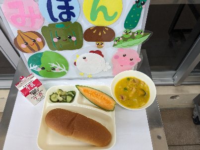 今日のメニューは、けいにくとかぼちゃのシチュー・ミックス海そうのサラダ・クインシーメロン・黒糖パン・牛乳です。