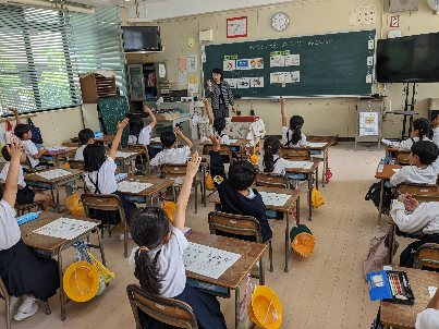 栄養教育推進事業の授業の様子です。栄養教諭から、給食のルールについていろいろ教えていただきました。自分たちの食べ方が正しいことを褒めてもらい、喜んでいました。最後まで楽しく授業を受けていました。