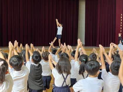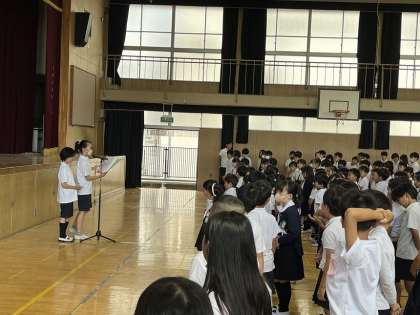 姿勢体操の後、教頭先生からは熱中症についてのお話がありました。睡眠や水分補給、帽子をかぶることなどに気をつけましょう。次に看護当番から先週の反省と今週の目標について報告がありました。安全に気を付けて学校生活を送りましょう!