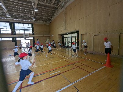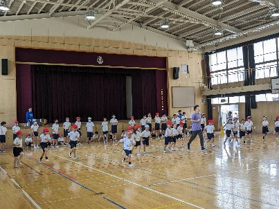 体育の授業の様子です。1年生が、スポーツテストのシャトルランの記録を取っていました。初めてのシャトルランなので、6年生が補助についてくれました。見本を見せてくれたり、回数を数えたり、声援を送ったり、いろいろなサポートをしてくれました。いい記録が出るといいですね。