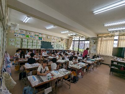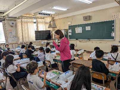 図画工作科の授業の様子です。初めて絵の具を使います。みんな、わくわくしながらパレットに好きな色を2色入れていました。