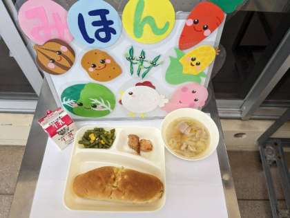 今日のメニューは、鶏肉のガーリック焼き・スープ・さんどまめとコーンのサラダ・おさつパン・牛乳です。