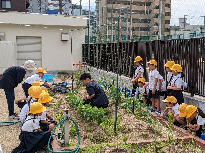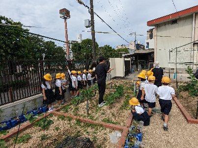 生活科の授業の様子です。学習園で、植物の観察をしていました。1年生は、オクラ・きゅうり・枝豆などの野菜を植えています。しっかり観察しましょうね。水やりもお願いします。
