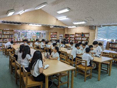読書活動の様子です。みんな静かに自由読書を楽しんでいました。今日は暑かったので、涼しい図書館での読書は最高ですね。