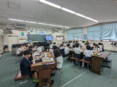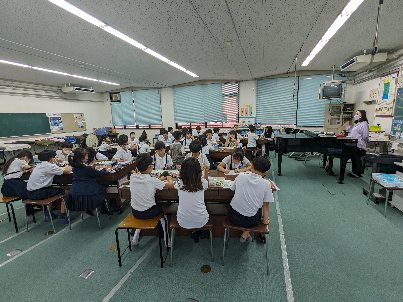 音楽の授業の様子です。鑑賞の学習をしていました。鑑賞曲は、ビゼーのファランドールです。皆さんも聴かれたことがあるのではないですか。別々に演奏されていた2つの旋律が、1つに重なる迫力のある曲です。「アルルの女」第2組曲の第4曲「ファランドール」は、王の行列・馬のダンスの2種類の民謡をもとに作られていて、。その荘厳さと、打楽器を使用した活気あるテンポから、コンサートにおけるアンコールで人気が高い楽曲となっているそうですよ。。