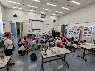 外の見学を終え、水道記念館に着きました。この後映像を見て、実験をします。原っぱの地下には、できたての水道水が貯められています。