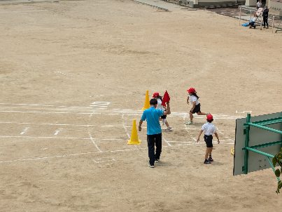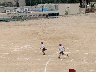 50メートル走の様子です。3年生になると体も大きくなって体力も伸びます。どれくらい伸びたのか、昨年の記録と比べてみましょう。