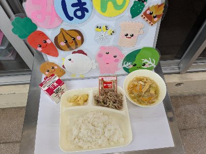 今日の献立は、ゴーヤチャンプルー(かつおぶし)・五目汁・あげ焼きじゃが・ごはん・牛乳です。